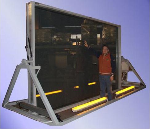проем для стекла 330Х230 см, " окрашенный с распылением, " 4 поворотных ролика с тормозами " Габариты 4000x1500x2800h " Вес 1700 кг " 1 электрическая панель " 2 поршня для поворота пресса на 90 градусов " 2 поршня для открытия пресса как "книжка" " 1 стекло (незакаленное) толщина 15 мм размеры 350х250 см " 1 вакуумный насос 6 м3, 230 В, сухой " 1 шелкографический ковер с кромкой "ласточкин хвост",размеры 350х250 см " 2 неоновых ванны с желтым светом |